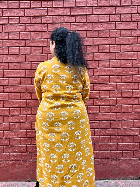 Mustard Hand-Sketch A-Line Kurta” with pockets ⭐
