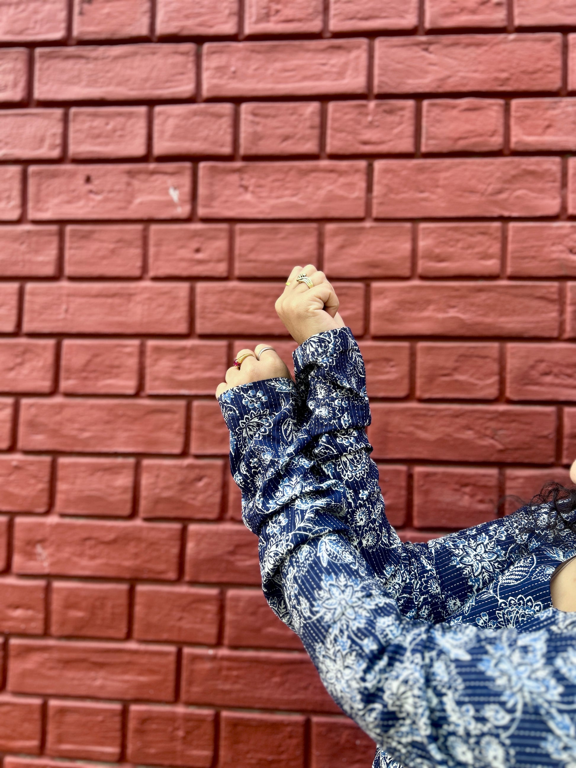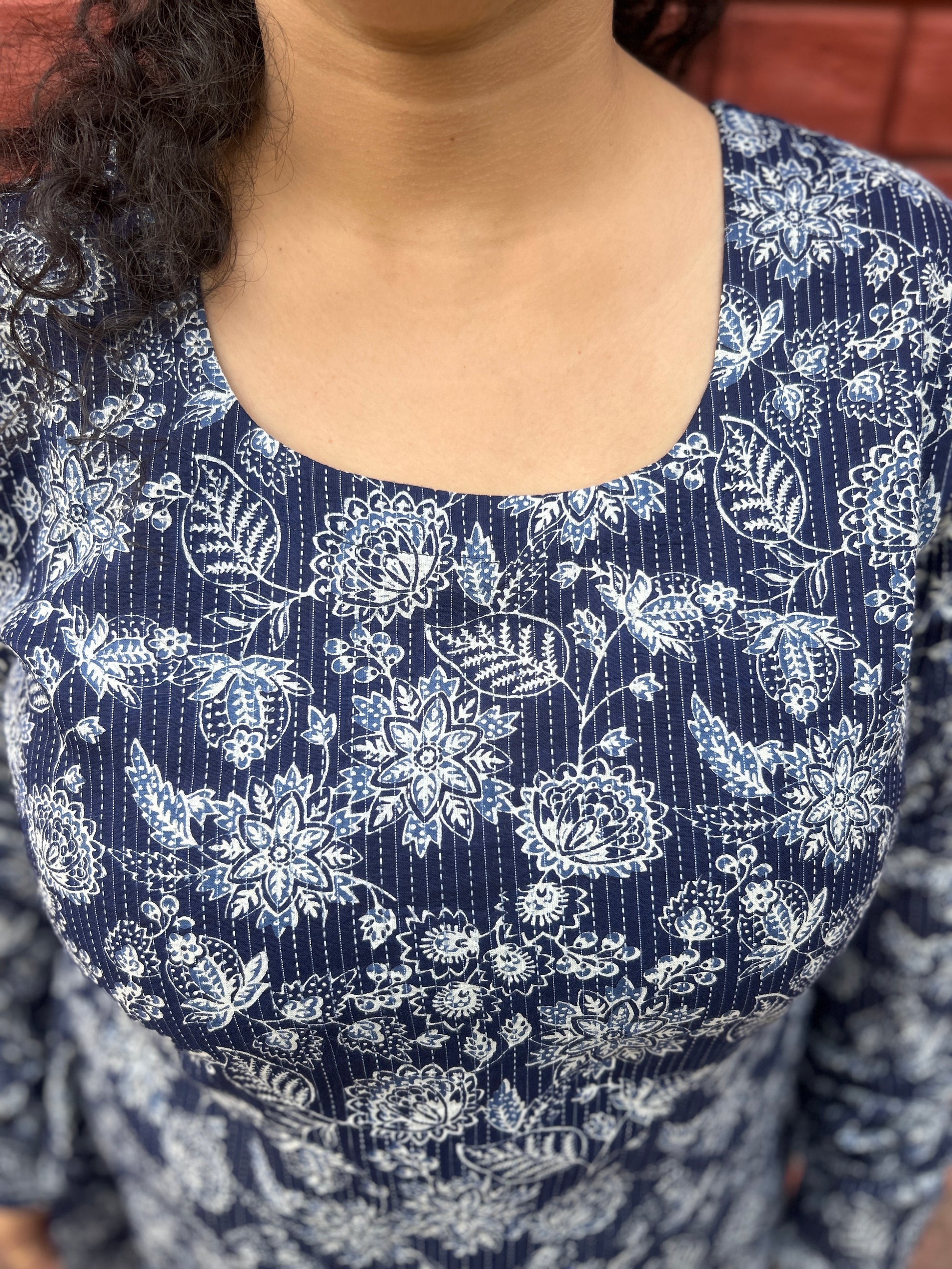 Indigo cotton kurta with delicate floral print, chudi sleeves with tich buttons, straight fit—soft, breathable, everyday wear. 💙