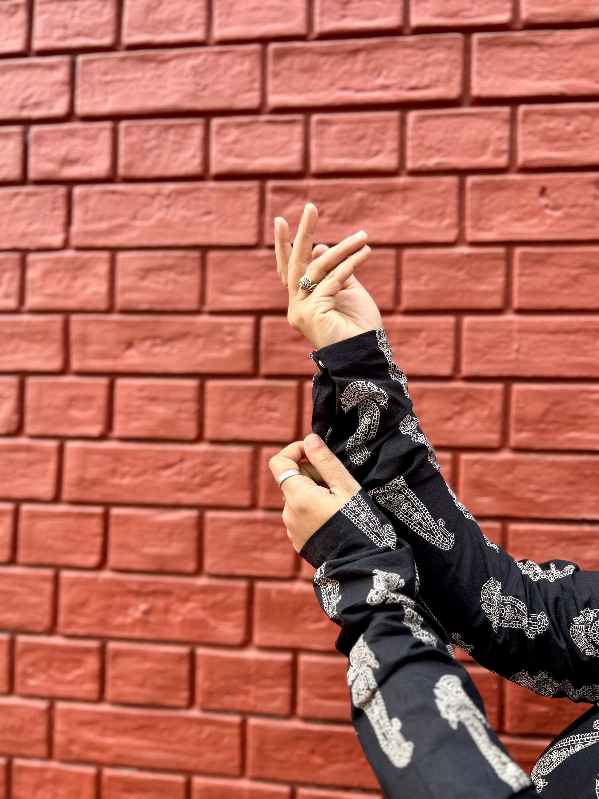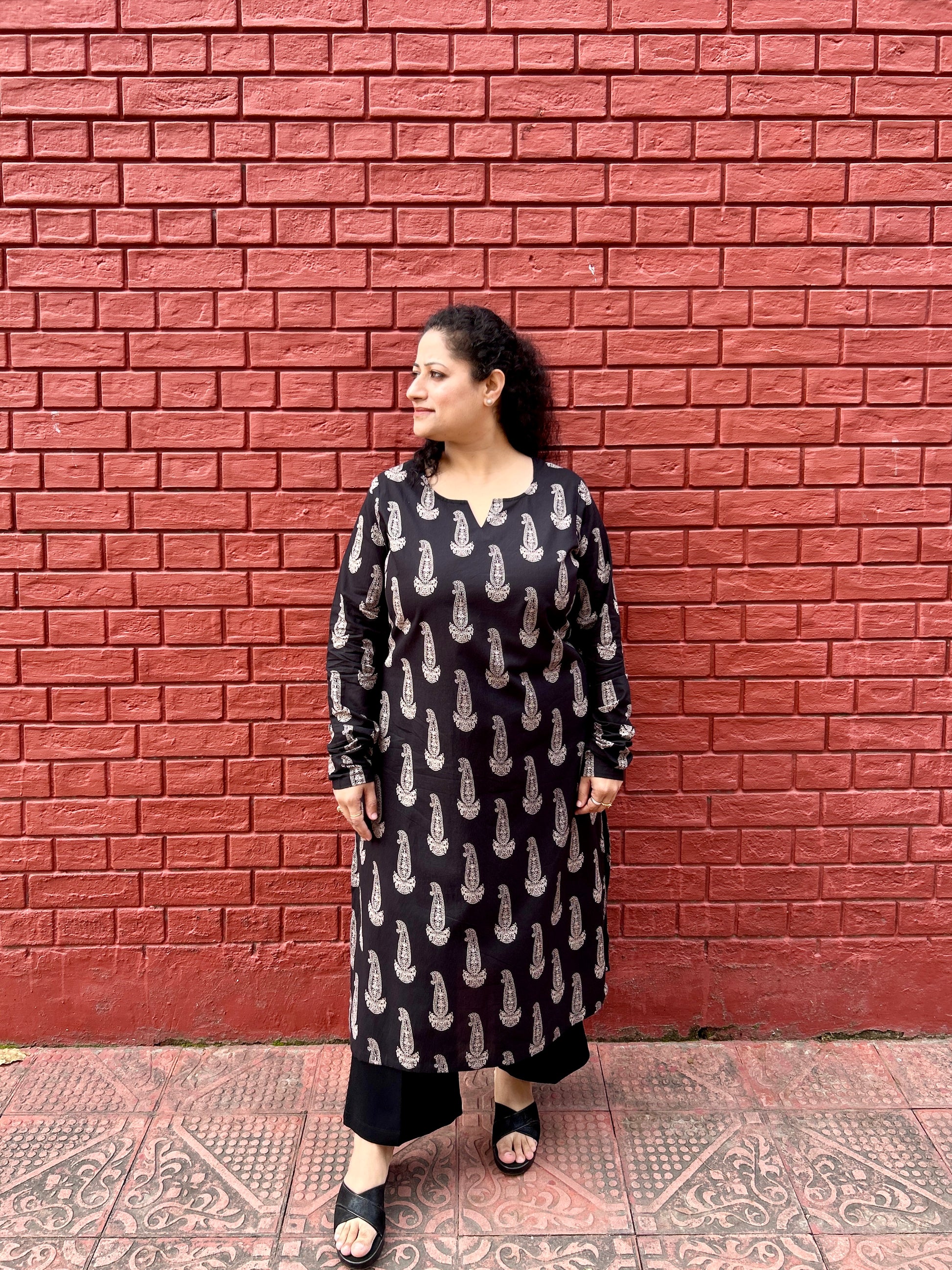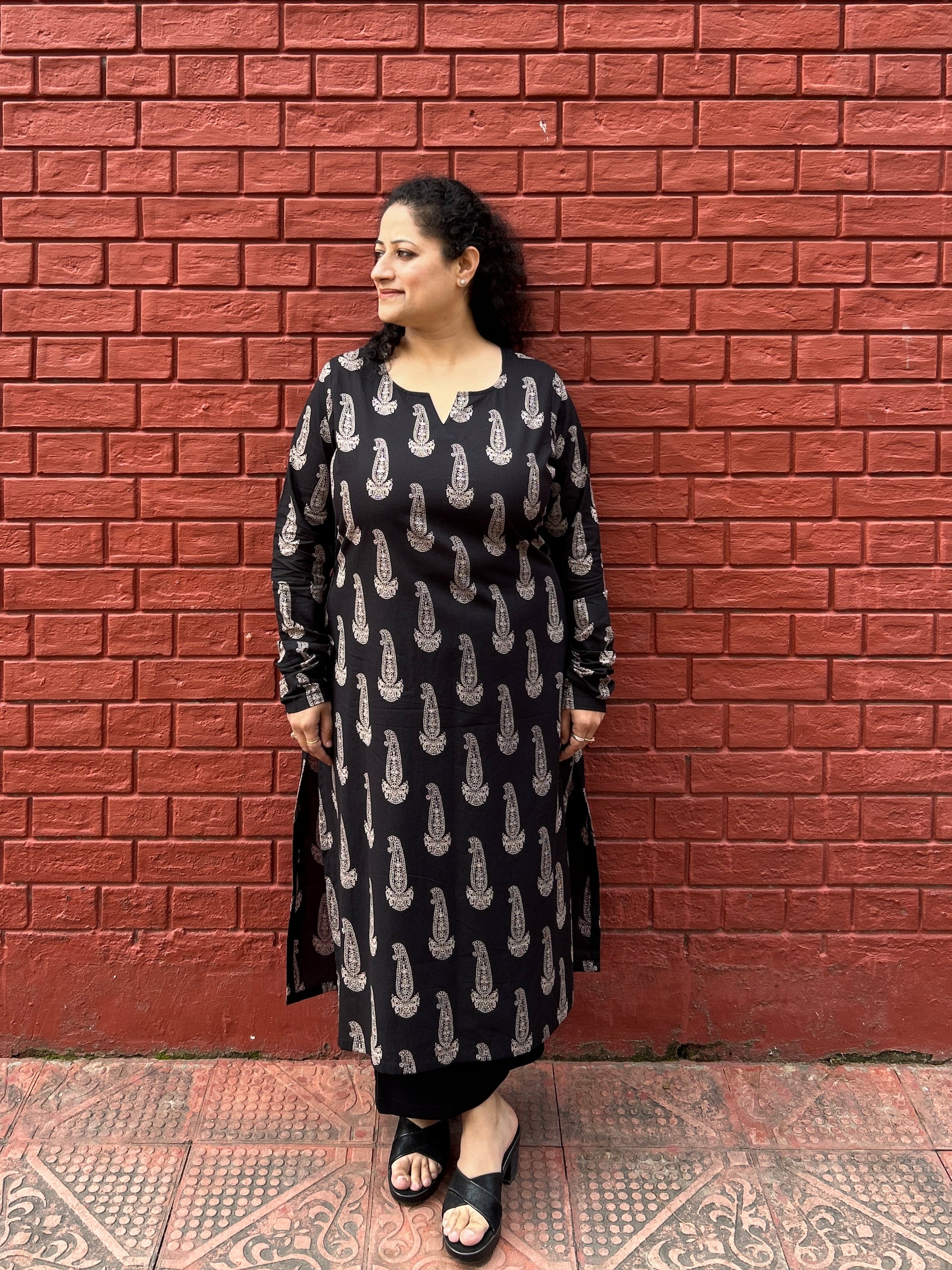 Black cotton kurta with paisley print, chudi sleeves with tich buttons, straight fit—easy, comfortable, everyday wear. 🖤