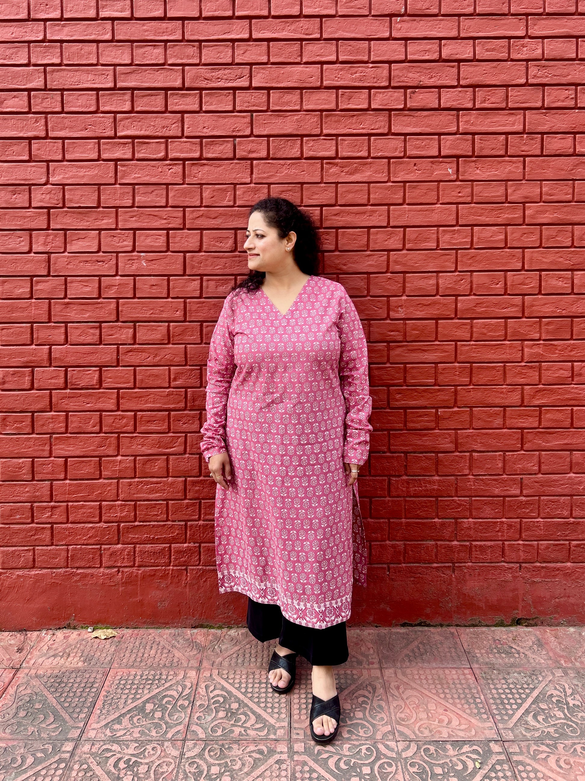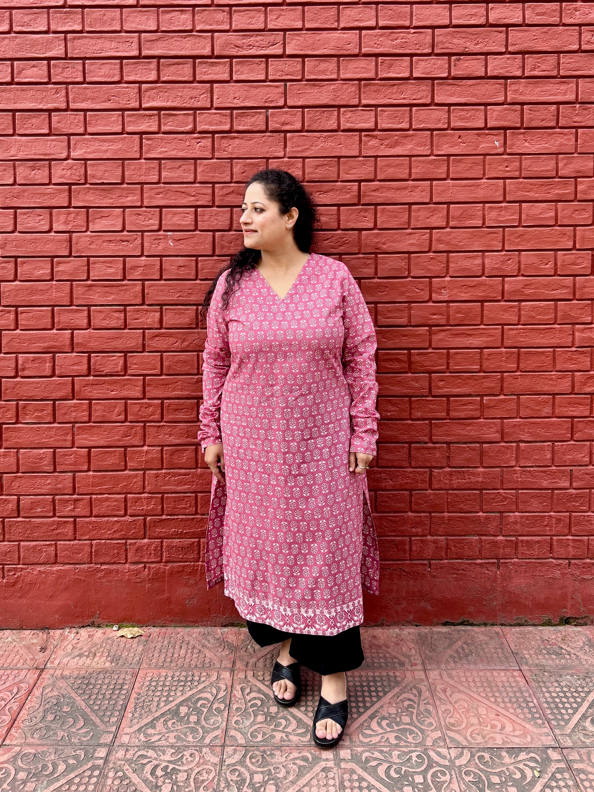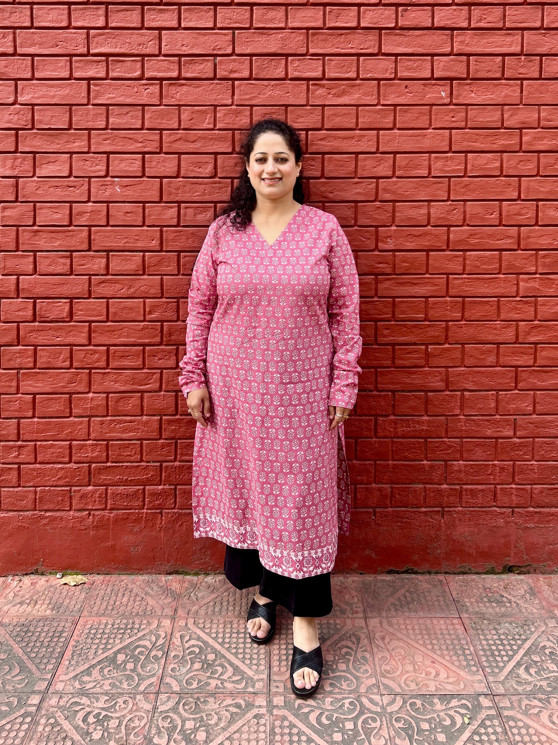 Beautifully adorned flower inspired print. Designed with classic notched V neck. It also has chudhi sleeves.