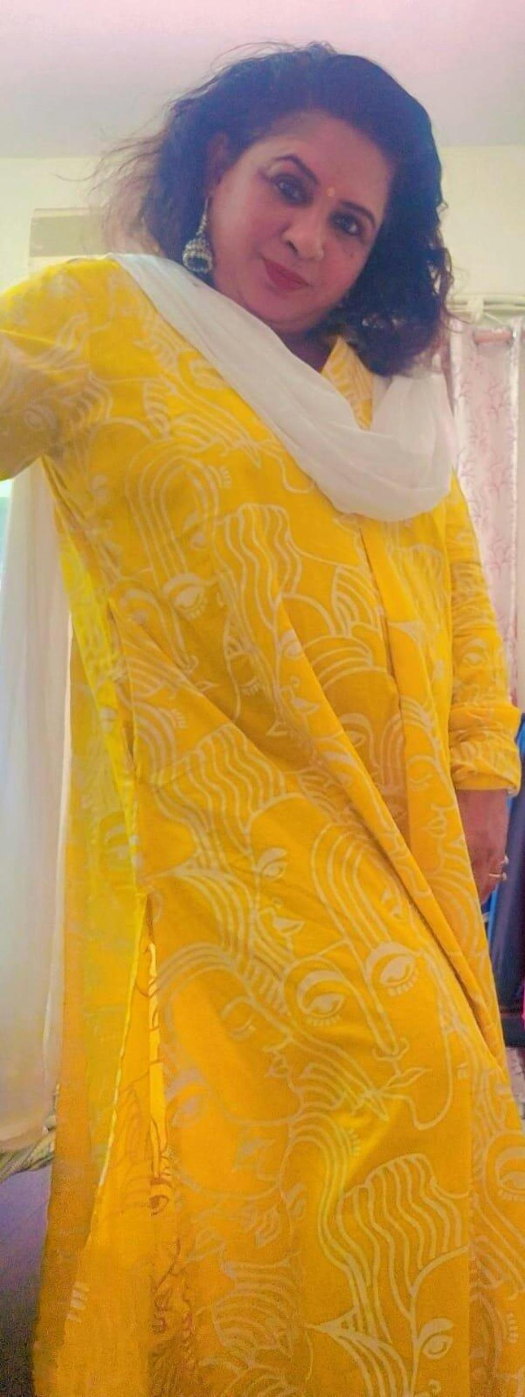 A vibrant mustard A-line kurta with abstract face art that celebrates expression and individuality. Crafted in soft, breathable cotton for all-day comfort. And yes… POCKETS, because function matters as much as fashion. It has chudhi sleeves with tich buttons.