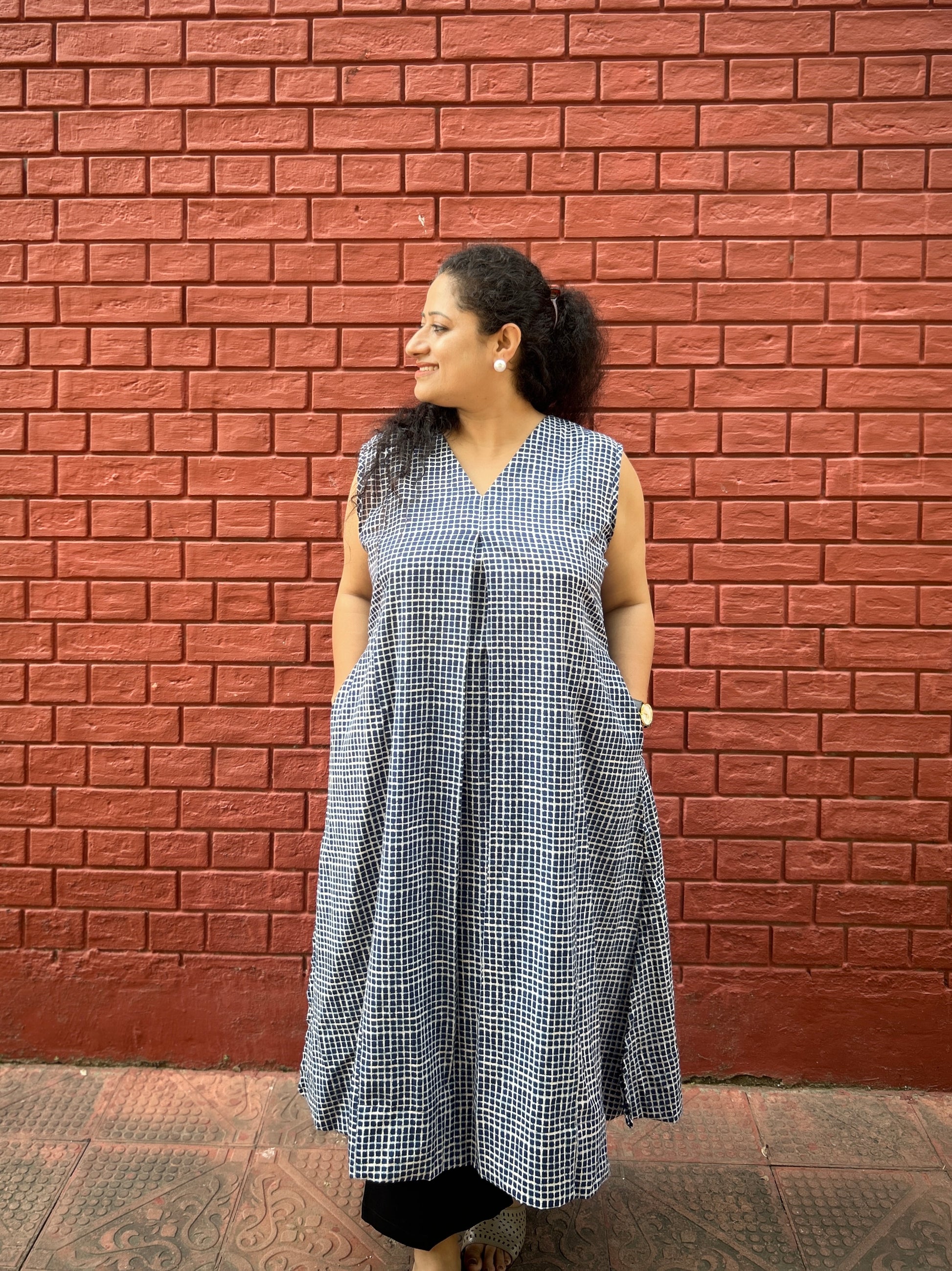 A breathable & super-comfortable A-line kurta with two functional pockets, in classic navy checks. Made in 100% soft cotton with a flattering V-neck and flowy fall. Perfect for daily wear, work or weekend outings .