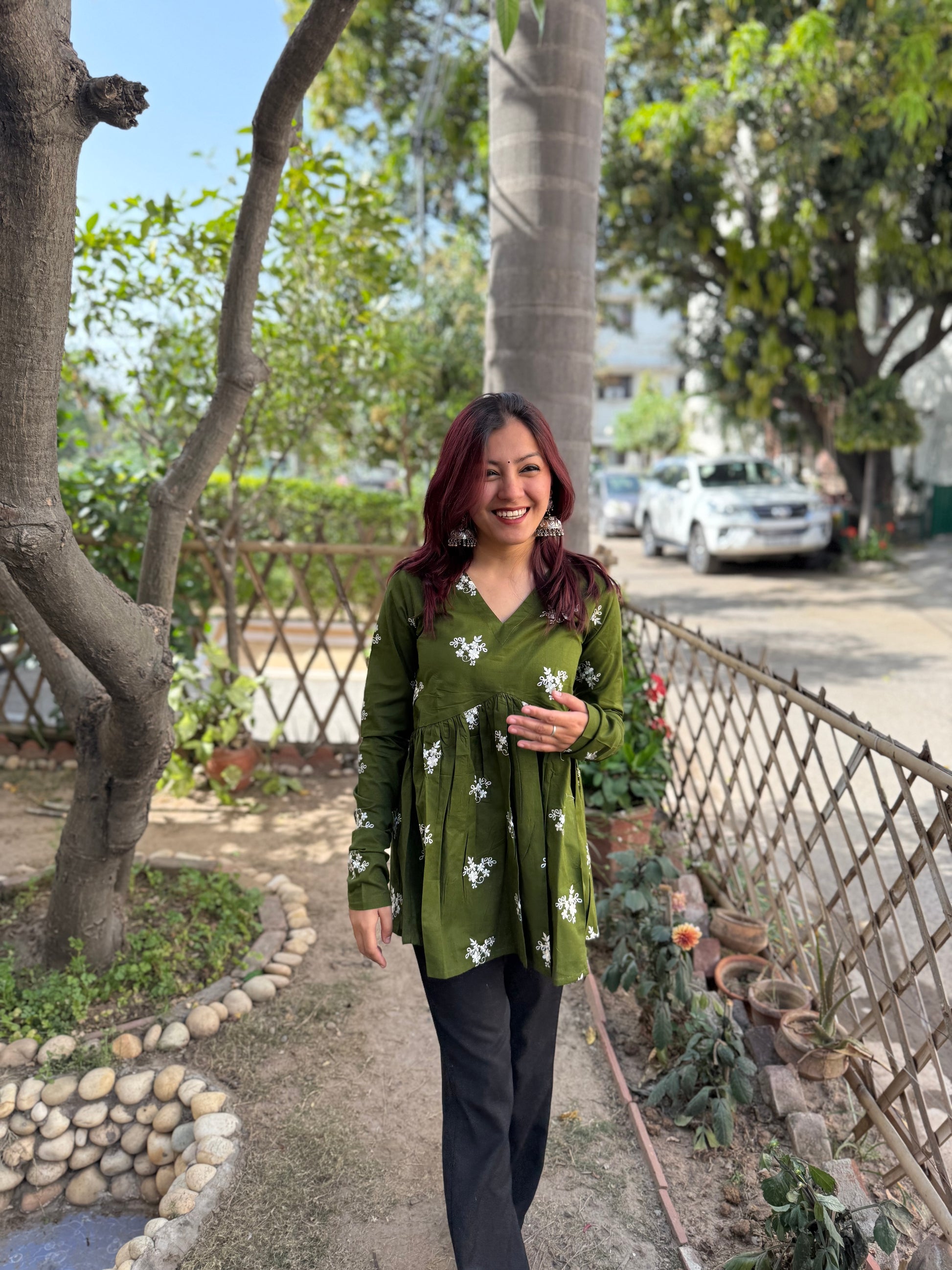 Embrace a vibrant and playful look . Crafted from soft cotton, this deep mehndi green beauty features delicate floral motifs and a flattering V-neckline. The gathered peplum adds a breezy, feminine charm while the full chudhi sleeves make it perfect for layering or standalone styling. Pair it with black trousers or denim for a versatile look