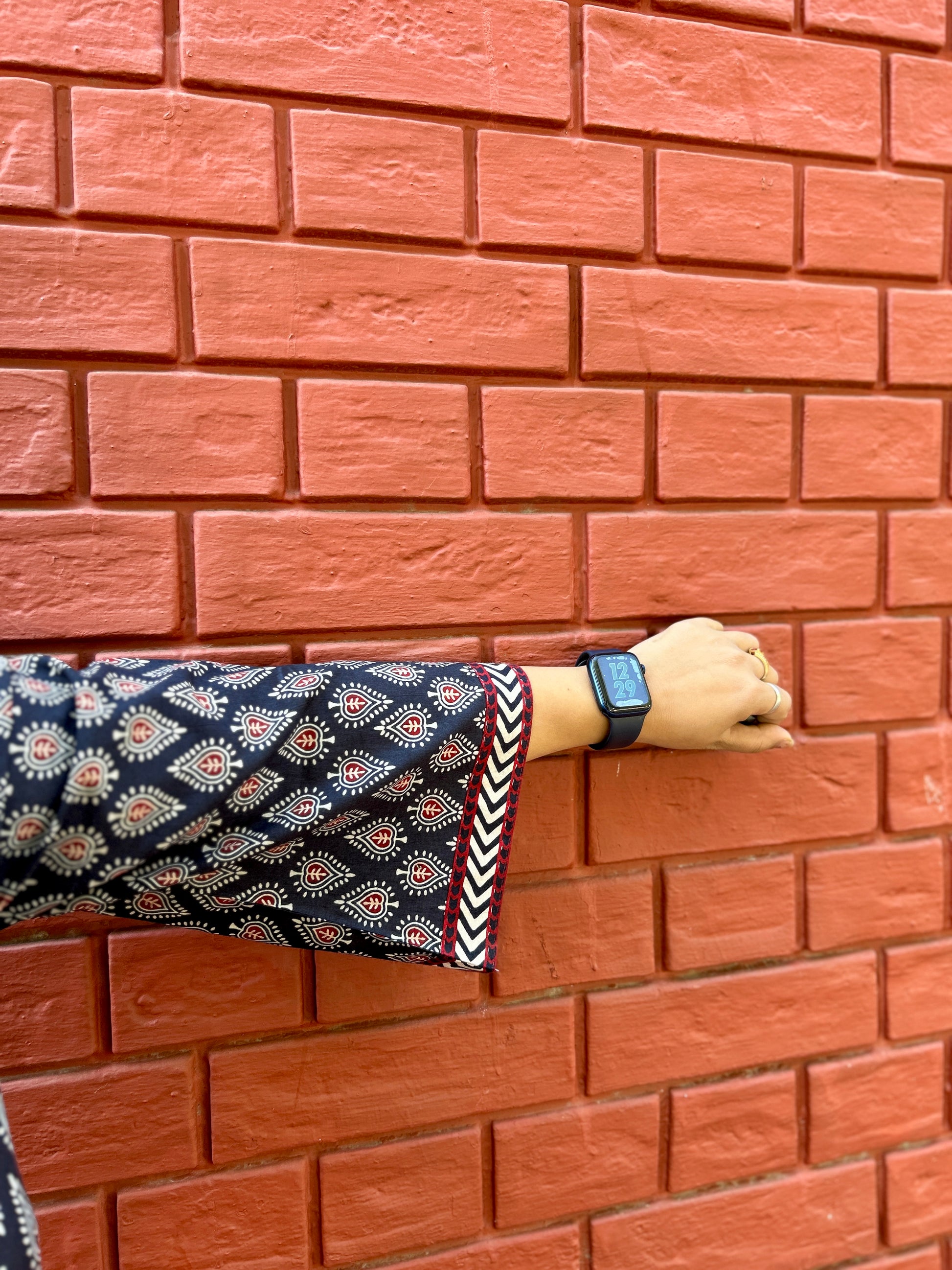 Set against a deep charcoal-black base, this kurti features an all-over ikat-inspired motif in rust red and ivory — giving it a contemporary ethnic appeal. The contrast chevron detailing on the V-neckline and sleeve cuffs adds a refined touch that sets it apart.