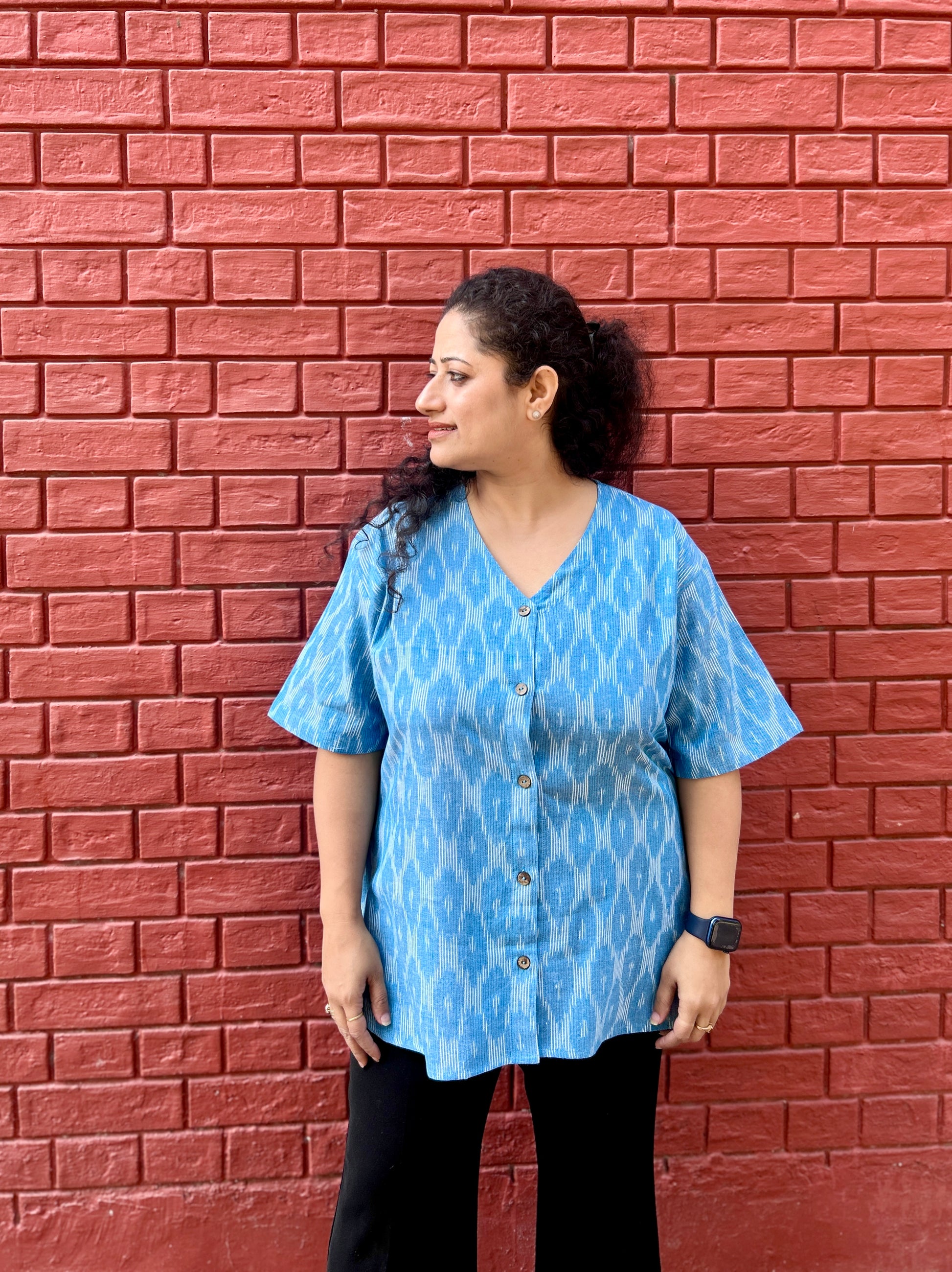 A calm, breezy light blue ikkat shirt with wooden buttons and soft Ikat-inspired print.