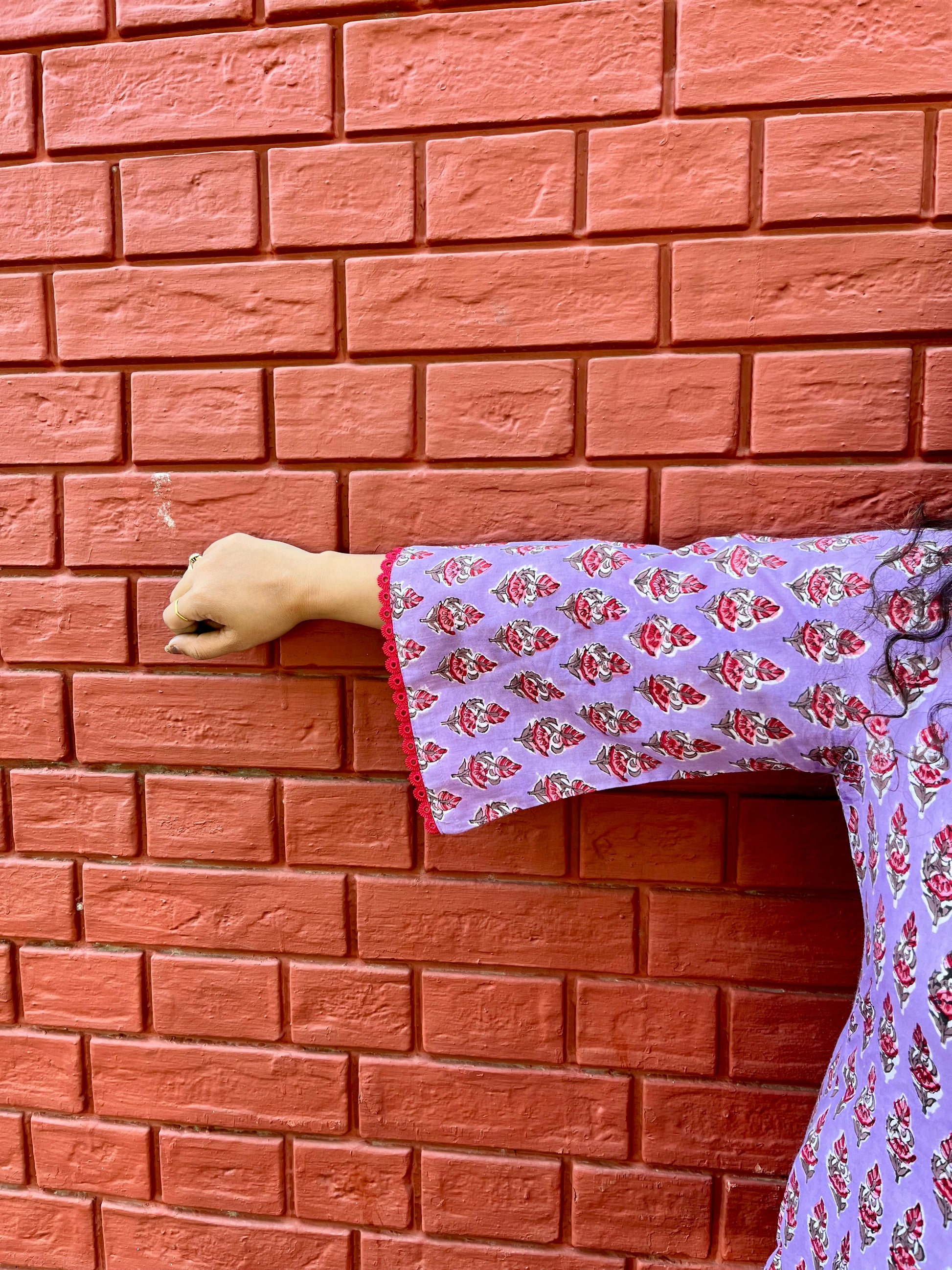 Crafted from soft, breathable cotton, this kurti features a charming all-over handblock floral print in shades of red and green over a soothing lavender base. The straight silhouette ensures a flattering fit for all body types, while the 3/4th sleeves are beautifully finished with delicate red lace detailing, adding a touch of handcrafted charm.