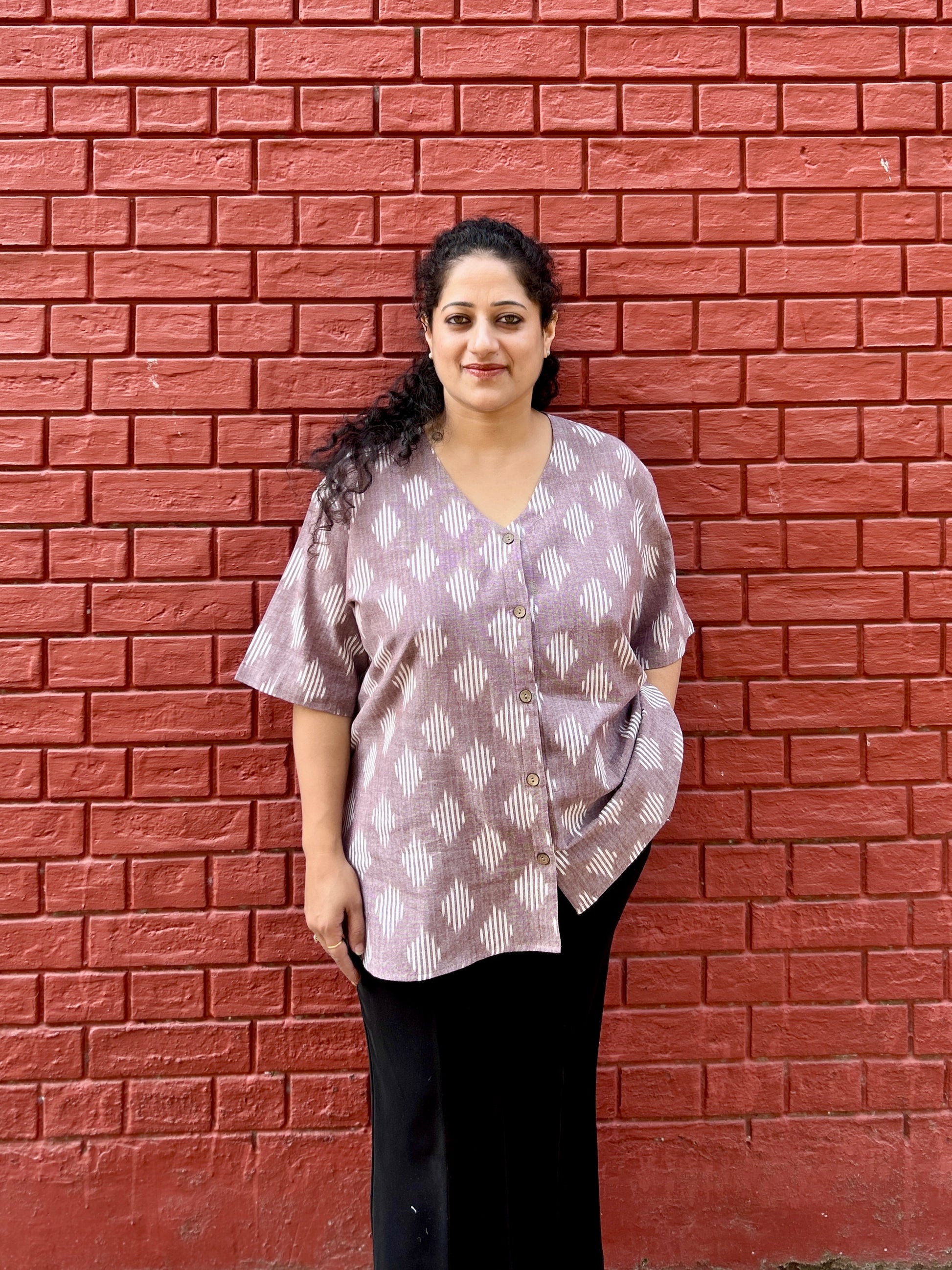A classic with a twist – our Light Wine Colour Ikat Button-Down Tunic blends tradition with effortless elegance. Featuring a striking handwoven Ikat pattern in shades of white on rich wine, this piece comes with a flattering V-neckline and front wooden-style buttons for a rustic yet polished touch. The half sleeves make it ideal for year-round comfort.