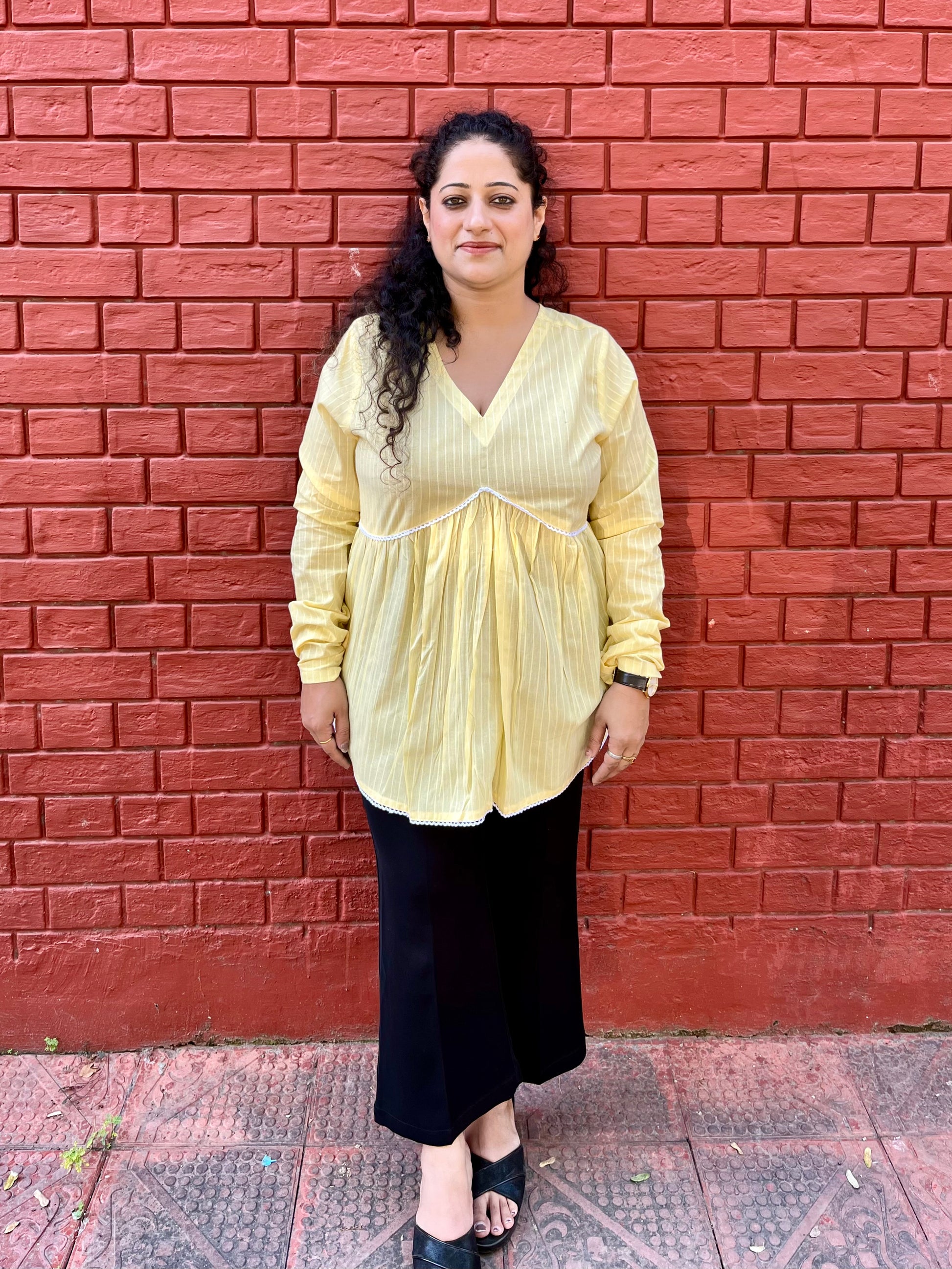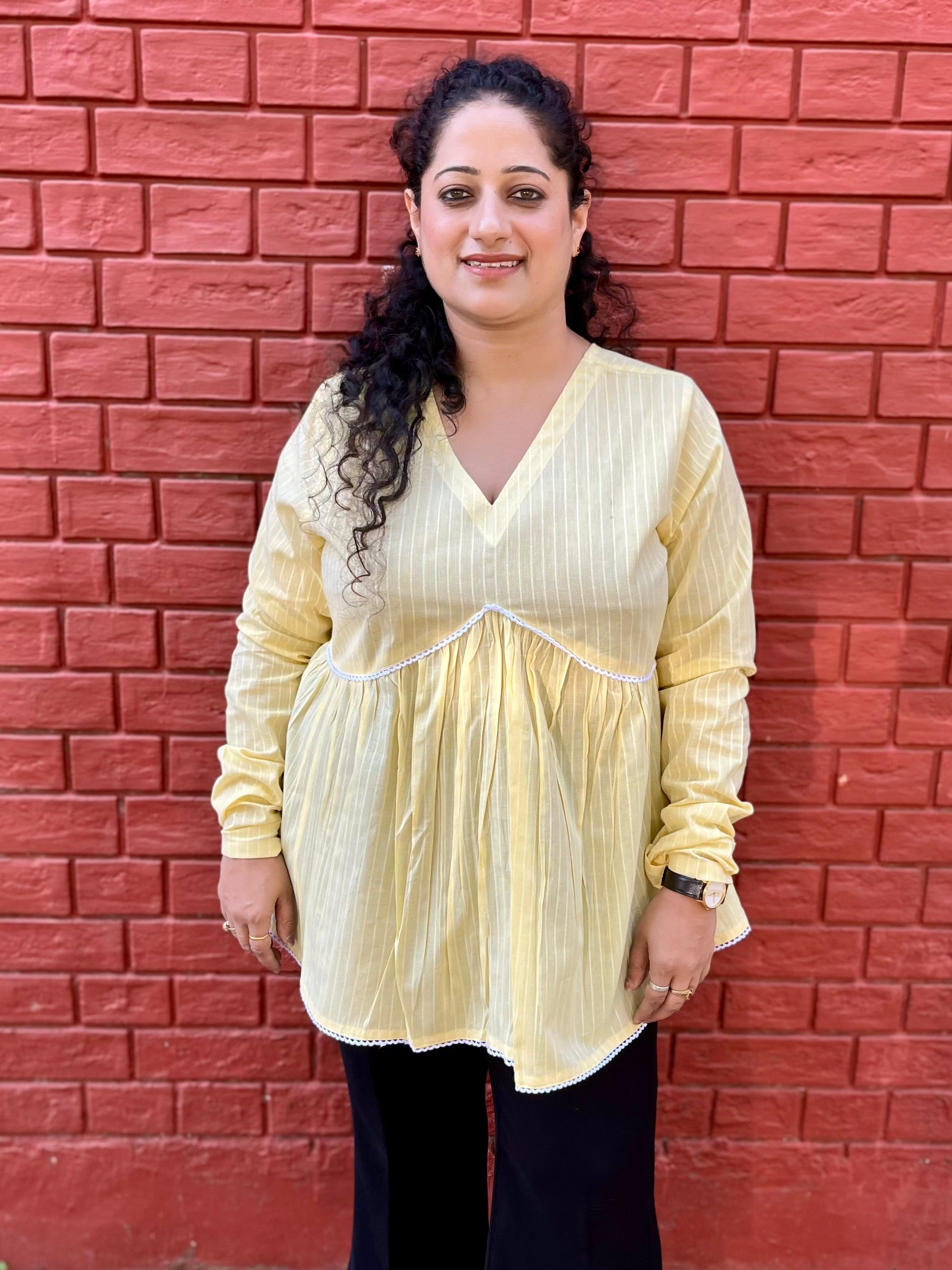 Brighten your day with our Sunshine Yellow Pinstripe Pleated Top. Tailored in soft, breathable cotton, this top features delicate vertical white stripes, a V-neckline, and a flattering empire waistline with soft gathers. Finished with dainty white lace trimming on the hem, it's a perfect pick for effortless charm.