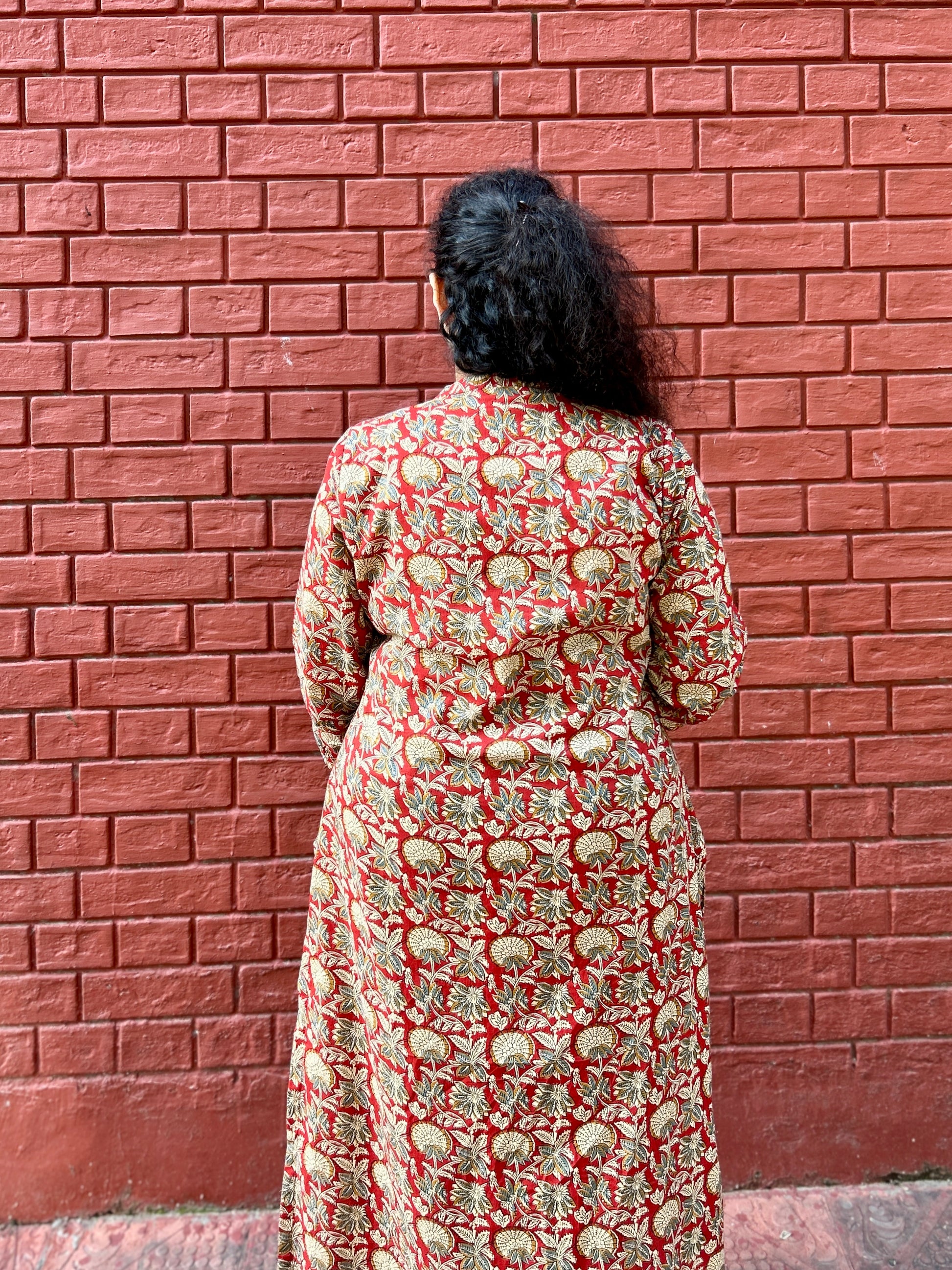Highlighted by an all-over floral heritage print in soft beige and olive tones. Designed with a classic notched neckline