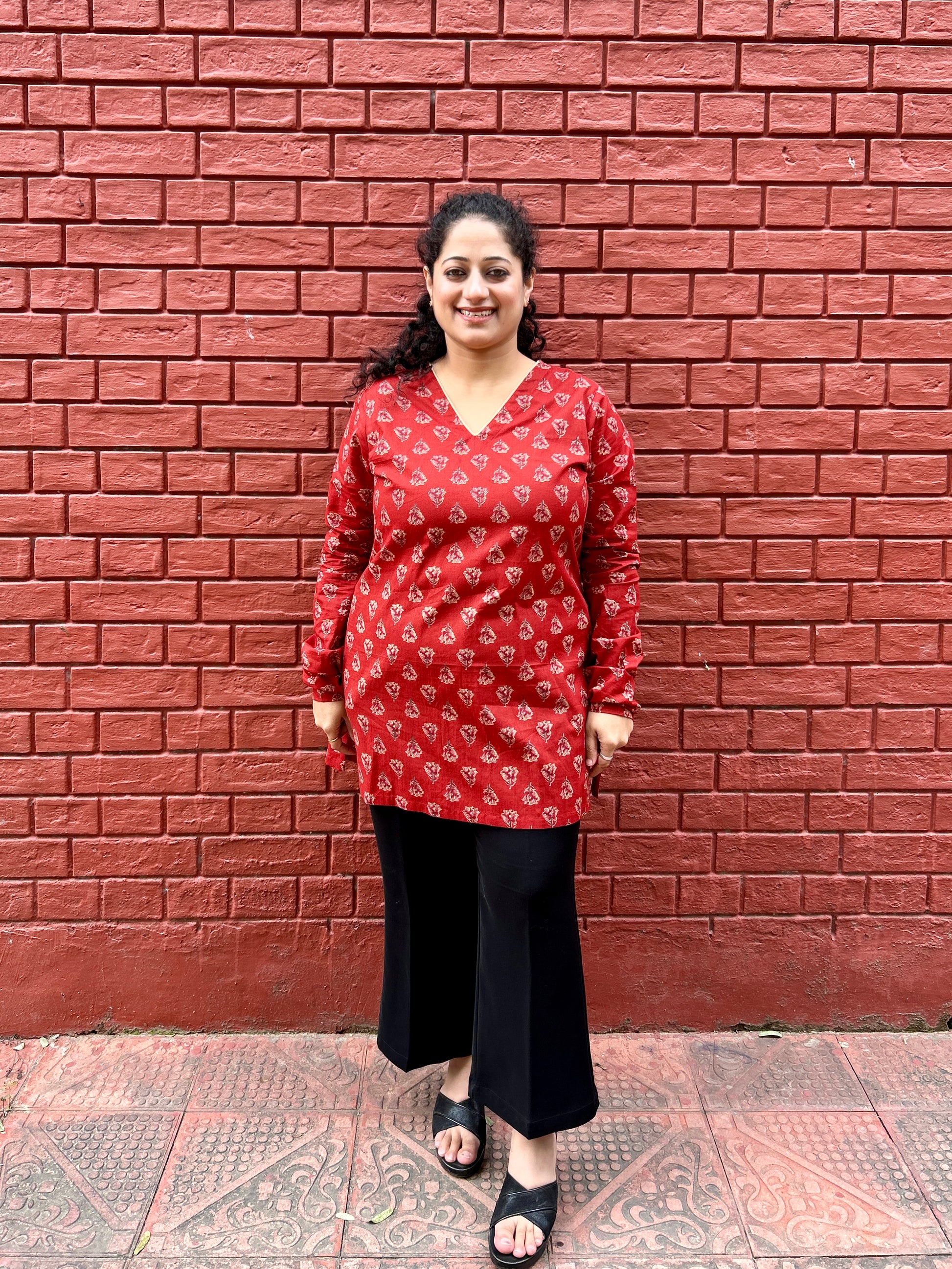 Red colour cotton kurti with all-over small booti print amd with a contrast piping on neck. Straight fit with V-neck and full sleeves. Soft, breathable fabric suitable for daily wear.