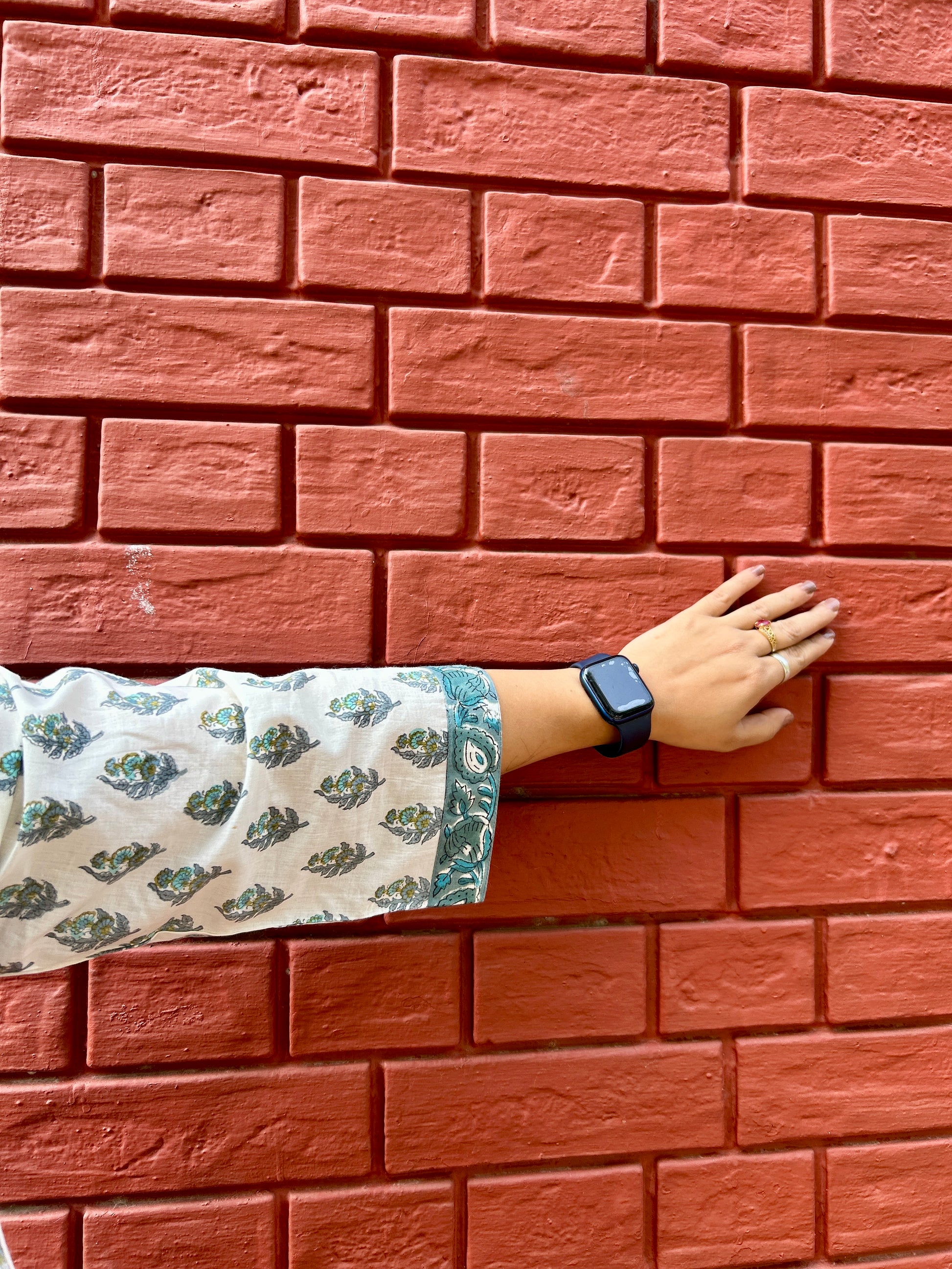 Ivory short kurti with Ferozi butti and borders on neck and arms.
